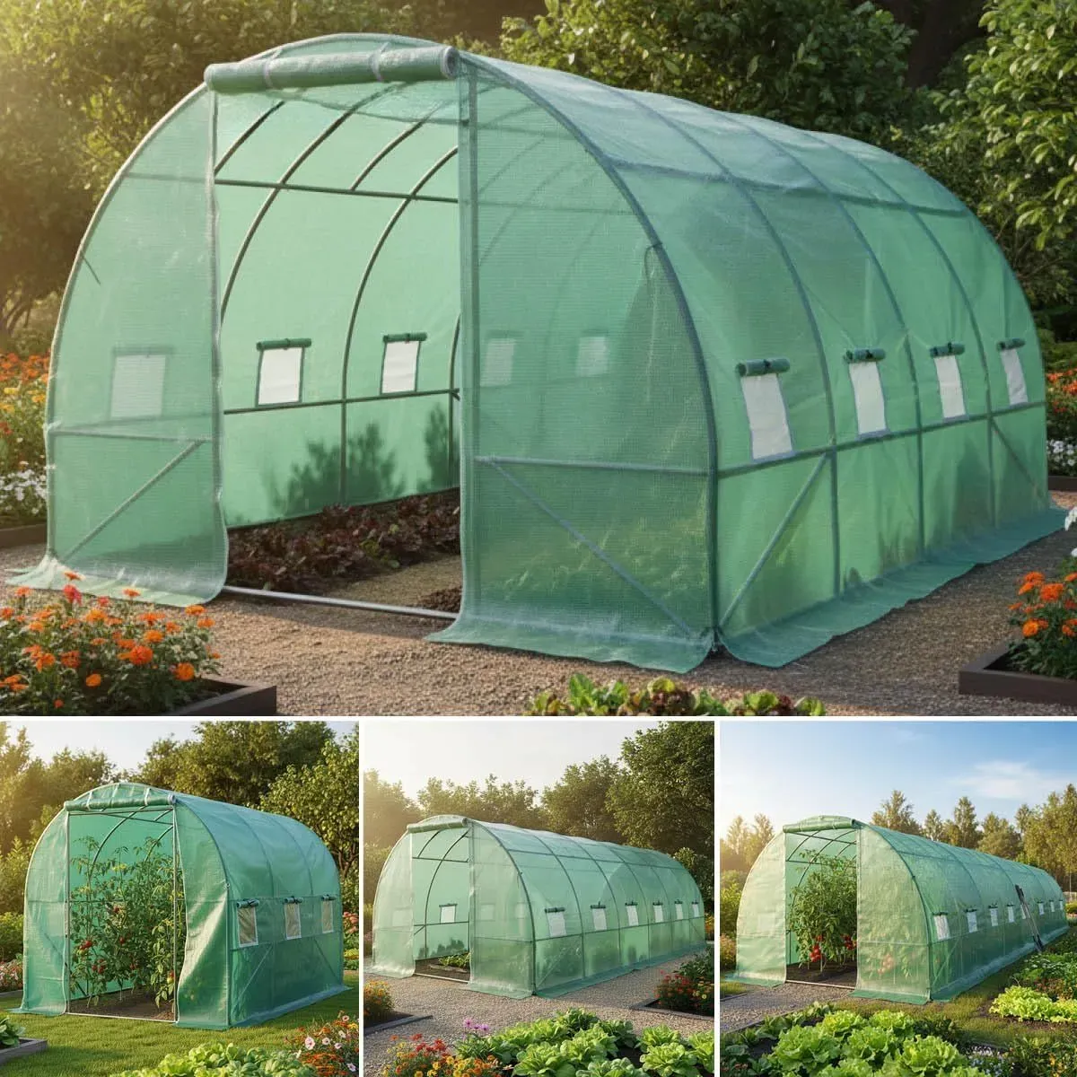 Dieses Foliengewächshaus mit der Größe 3x4m bietet eine Fläche von 12m² und eine Durchgangshöhe von 2m. Es ist ideal für den Anbau von Obst, Gemüse und Kräutern und schafft einen geschützten Raum für das Wachstum. Der Rahmen besteht aus doppelt feuerverzinkten Stahlrohren mit einem Durchmesser von 25 mm und einer Wandstärke von 0,8 mm, was für Stabilität sorgt. Zusatzkomponenten wie Metall Erdanker und fixierende Schrauben unterstützen einen sicheren Stand. Die UV-stabilisierte Spezial-Gitternetzfolie mit einer Dichte von 200g/m² ist robust gegenüber Wettereinflüssen und bietet Schutz vor Sonne und Wind. Überlappende Seitenränder sichern die Struktur am Boden. Zwei aufrollbare Türen und acht Fenster mit Moskitonetz sorgen für eine anpassbare Luftzirkulation. Die lichtdurchlässige Folie nutzt die Sonnenenergie effizient. Unkrautvlies ist im Lieferumfang enthalten.