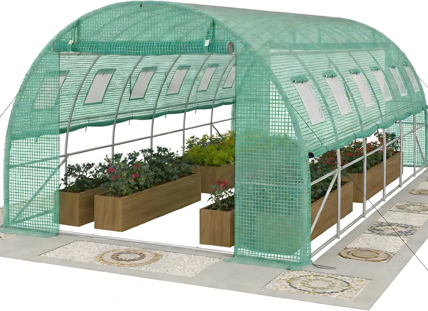 Stabile Stahlkonstruktion mit Querstreben für hohe Steifigkeit. Das Gewächshaus hält Wind und Schnee stand. Die aerodynamische Form leitet Witterungseinflüsse ab, während das Fundament eine sichere Basis bietet. Effiziente Klimasteuerung durch Rollfenster und hochrollbare seitliche Bereiche ermöglicht gute Luftzirkulation. Die Folie reflektiert Licht und ist eine langanhaltende Lösung. Gefertigt aus feuerverzinktem Stahl für Langlebigkeit und Rostschutz. Die Konstruktion bietet hohe Decken für mehr Platz und ist ideal für wachsende Pflanzen geeignet. Erweiterter Innenraum für hoch wachsende Kulturen, bietet mehr Bewegungsfreiheit beim Pflanzen. Die robuste Bogenkonstruktion und Belüftung machen es zu einem effizienten Tomatengewächshaus. Sorgfältiges Design und Optik, hochwertige Materialien sorgen für langanhaltende Funktion. Klare Bogenformlinien bringen Charme in den Garten.