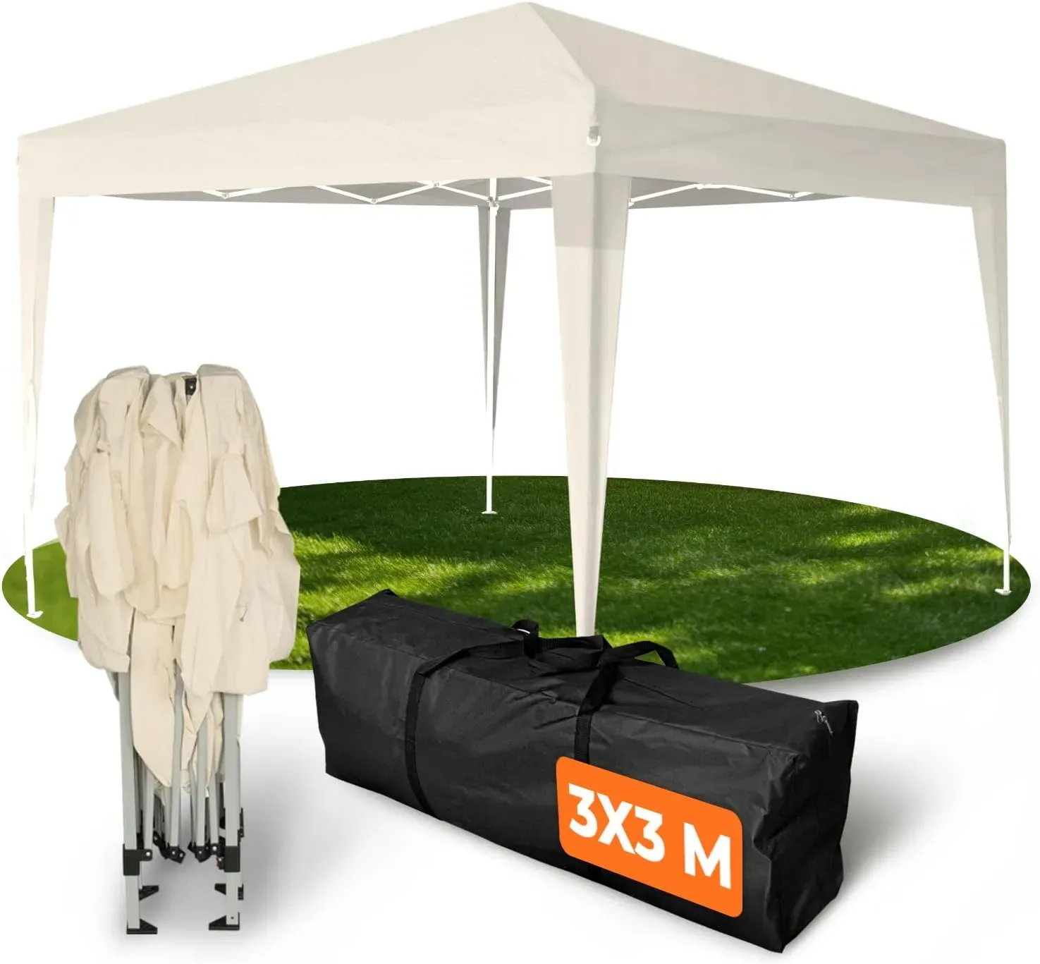 Einfach und schnell aufzubauen: Der 3x3 Meter Pavillon benötigt kein Werkzeug zur Montage. Robustes Faltgestell aus legiertem Stahl bietet Stabilität bei Wind und Regen. Geeignet für Gartenfeiern, Festivals, Märkte oder Camping. Dach mit Polyesterbeschichtung und versiegelten Nähten schützt zuverlässig vor Regen. Mit einem UV-Schutz von 50+ bietet der Pavillon Schutz vor Sonnenstrahlung. Erhältlich in Champagner/Weiß mit vormontiertem Dach, Abspannseilen und Erdspießen.